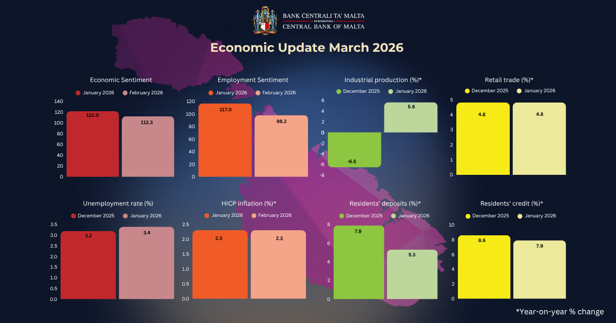 Malta’s business activity continued to expand in February, with the Central Bank’s Business Conditions Index showing a slight increase in annual growth compared to the previous month. Activity remained above its historical average, signalling continued economic resilience.