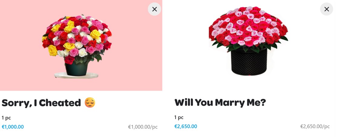 It turns out the €1,000 “Sorry, I cheated” bouquet is a 200-stem mixed rose arrangement, while the €2,600 “Will you marry me” option features a 500-rose floral design – practically a small garden delivered to your door.