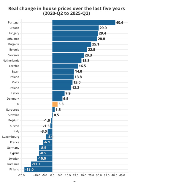 According to the latest Eurostat data, house prices in the EU rose by an average of 5.4 per cent year-on-year in the second quarter of 2025, marking the seventh consecutive annual increase. Seven countries recorded double-digit gains, led by Portugal (17.1 per cent), Bulgaria (15.5 per cent) and Hungary (15.1 per cent).