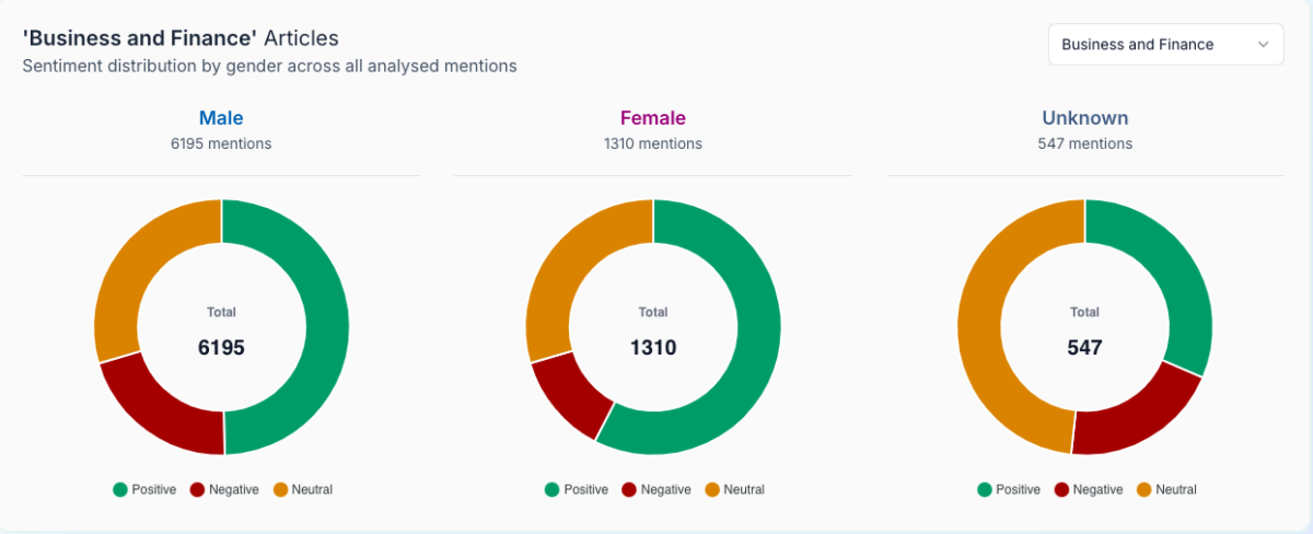 The disparity is particularly stark in business and finance reporting. Women accounted for just 16 per cent of mentions across 1,310 articles, while men dominated with 77 per cent, appearing in 6,195 articles. The findings point to a structural imbalance in how economic narratives are constructed and whose voices are amplified.