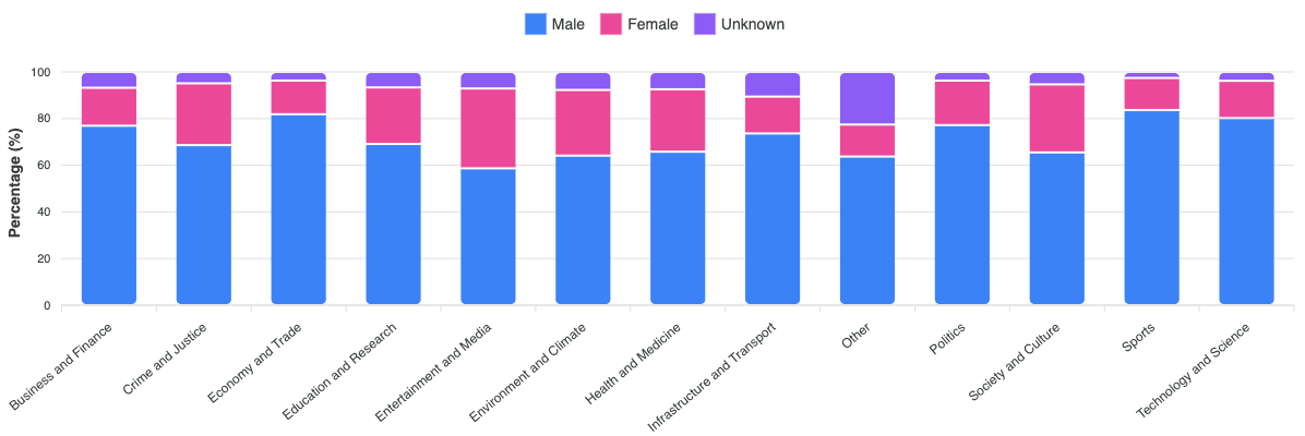 Across all sectors, there was no category in which women were mentioned more than men. The closest gap was recorded in entertainment and media, where women made up 34 per cent of mentions (7,903 articles), compared to 59 per cent for men (13,549 articles). Women were least represented in economy and trade, as well as infrastructure and transport.