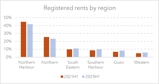 Rental activity is also becoming more geographically dispersed. There are now 19 localities in Malta with more than 1,000 active rental contracts, including one locality in Gozo. St Paul’s Bay remains the locality with the highest number of contracts, exceeding 10,000, followed by Sliema, Msida, Marsaskala, St Julian’s, Gzira and Birkirkara. Overall, while the Northern Harbour and Northern regions remain dominant, the share of contracts in all other regions has increased over the past three years, indicating a gradual expansion of rental demand beyond the traditional hotspots.