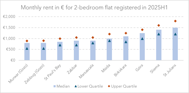 Recent data illustrate these differences clearly. For example, the median rent for a two-bedroom apartment in St Paul’s Bay stood at €850 in the first half of 2025, with the lower quartile at €700 and the upper quartile at €1,000. In St Julian’s, the median was significantly higher at €1,500, with a corresponding quartile range between €1,200 and €1,800. In Gozo, rents tend to be more affordable: the median for a two-bedroom property in localities such as Żebbuġ (which includes Marsalforn) and Munxar (which includes Xlendi) was €800.