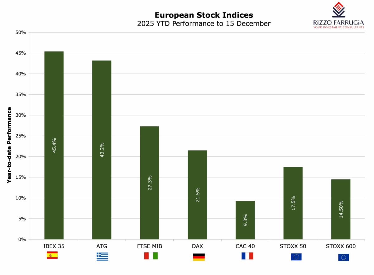 Italy’s main index, the FTSE MIB, also posted notable double-digit gains during 2025