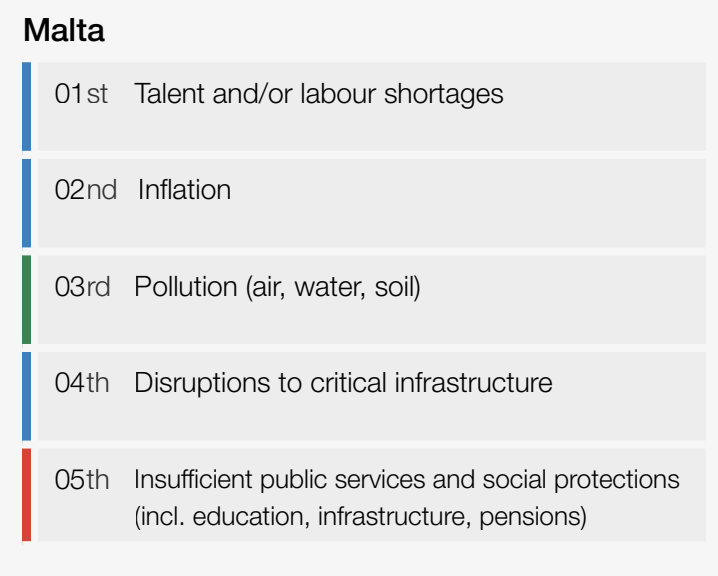 Inflation was ranked as Malta’s second most serious economic risk, followed by pollution, disruptions to critical infrastructure and insufficient public services and social protections.