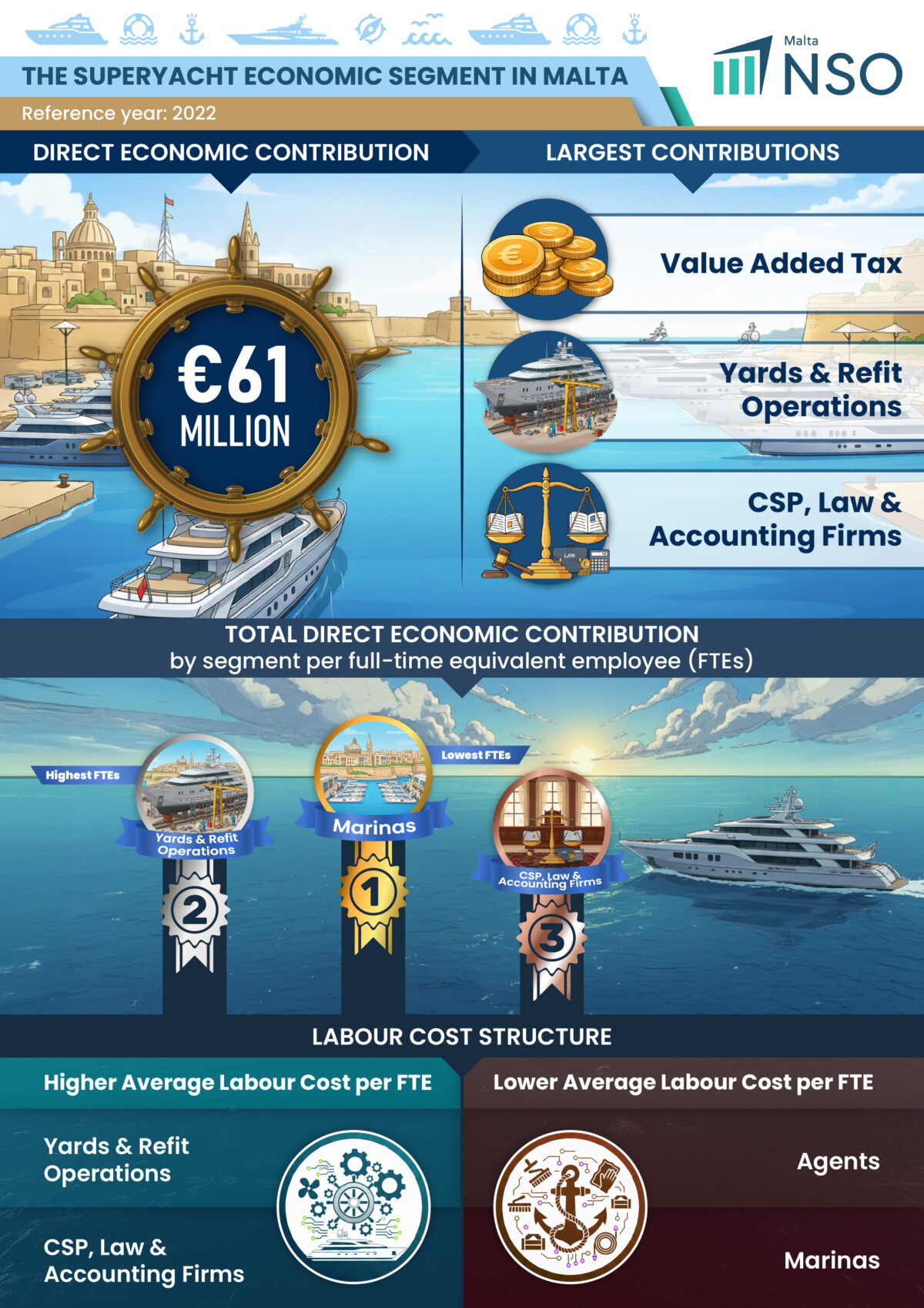 Vessel sales and registration account for roughly two-thirds of the Maltese superyacht sector’s €61 million direct economic contribution in 2022, according to a newly published study from the NSO analysing the structure and scale of this industry.